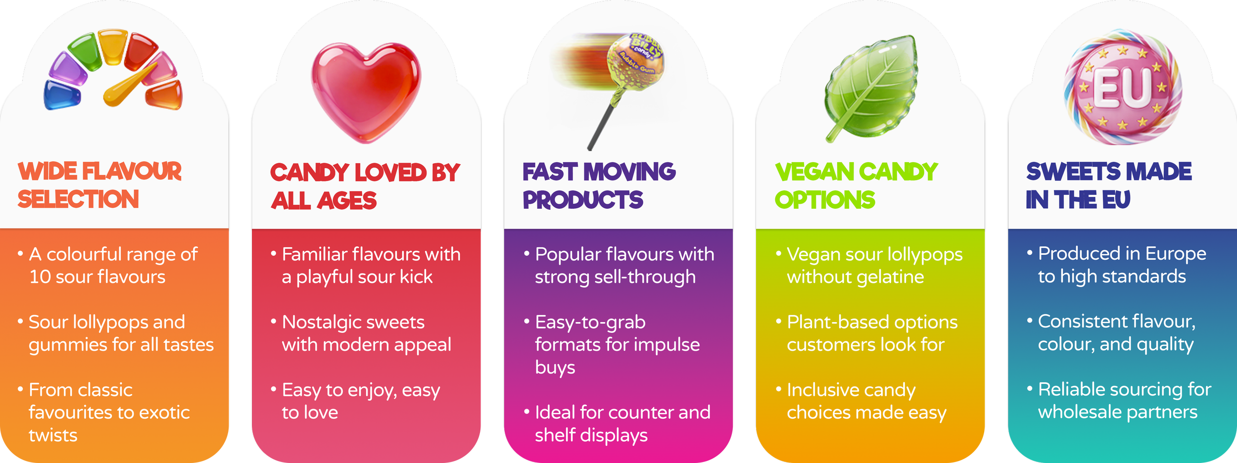 At Bubbly Billy Candy, we create sour sweets for every generation of sour lovers. From kids chasing bold flavours, to those drawn to exotic twists and unexpected combinations, and adults rediscovering childhood favourites, our sour lollypops and gummies bring people together through moments of fun, colour, and surprise.